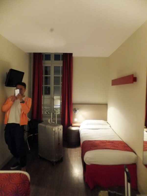 正直、狭い。フランスのホテルはどこもこんな感じらしいです。
