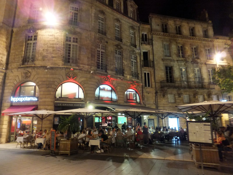 建物は比較的低く広い夜空。歩道にはカフェやレストランのテラスが軒を連ねます。