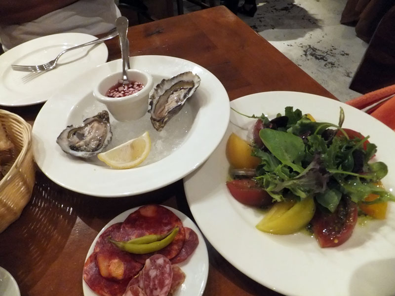 手前のサラミは付け出し。生牡蠣はワインビネガーのソースと一緒に。